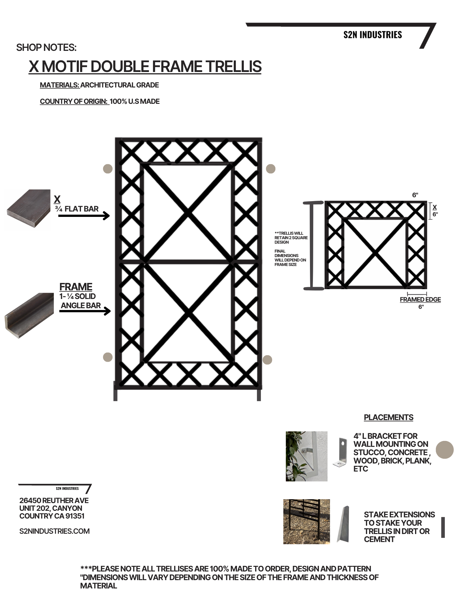 American Built: From the sketches to the final weld, your trellis is hand built in Los Angeles, California and made to order using durable 3/16 angle bar and flat bar to build a strong and durable frame that can support your growing garden.