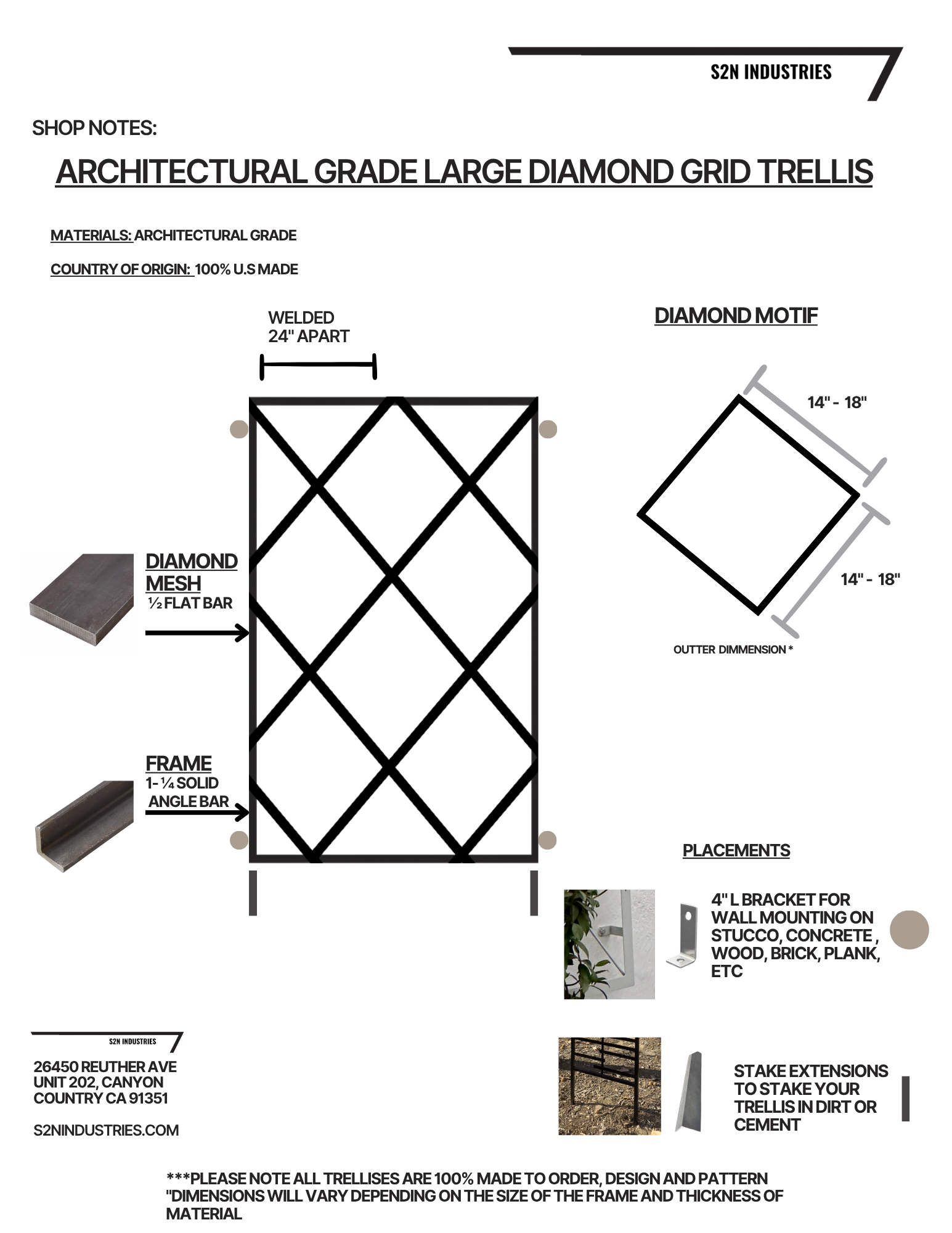 Whether you’re looking to create an eye-catching focal point or just need a solid metal wall-mounted frame to help your plants grow, let our large diamond pattern garden trellis guide your outdoor life and allow your plants to grow, bloom, and blossom—adding natural green beauty to your outdoor space. Hand-welded in Los Angeles, CA and built to order out of 100% solid metal to your specifications to give you a solid, weatherproof trellis that fits small gardens to large outdoor commercial properties, turning any boring wall into a beautiful backdrop for flowers and foliage.