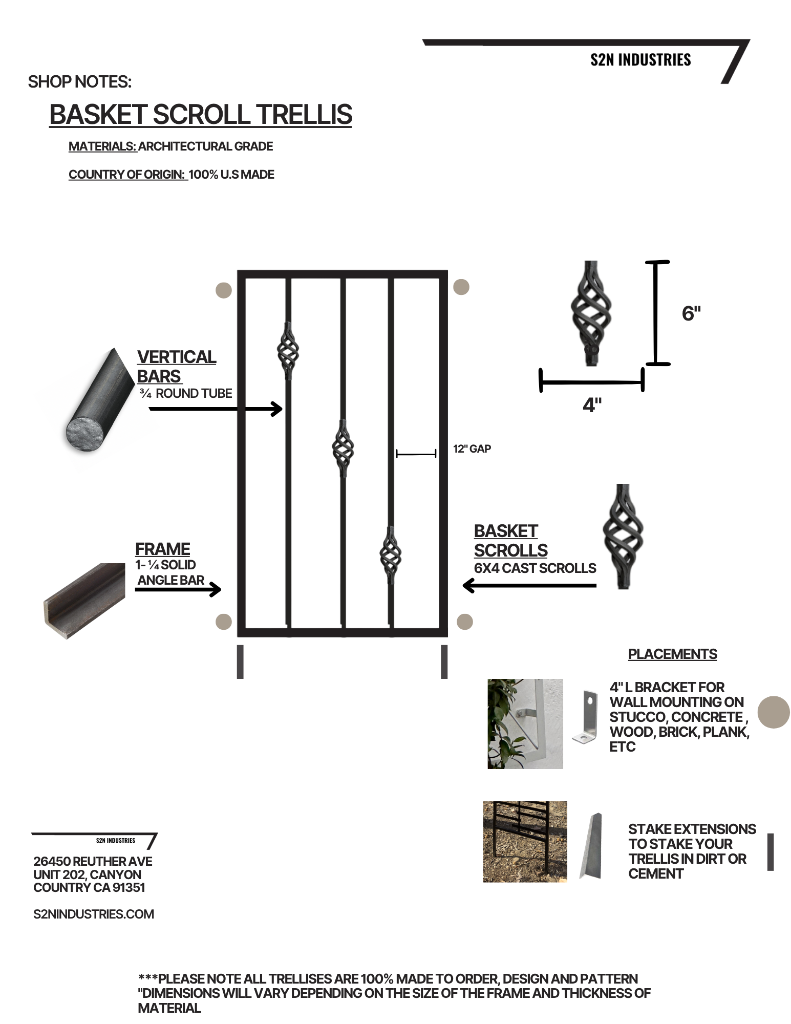 For this trellis, we use 3 vertical 3/4 square steel tubes every foot with a basket scroll on every tube to create a timeless trellis that's hand made to your specifications here in the in the USA. Available in various heights and widths so you can find one that fits your garden and landscape perfectly. Pick from multiple stunning finishes all powder coated to ensure it can withstand hard outdoor elements and last years to come. Easy installation that takes no more than 50 minutes. Easy to stake and to add beauty and functionality to any indoor or outdoor space
