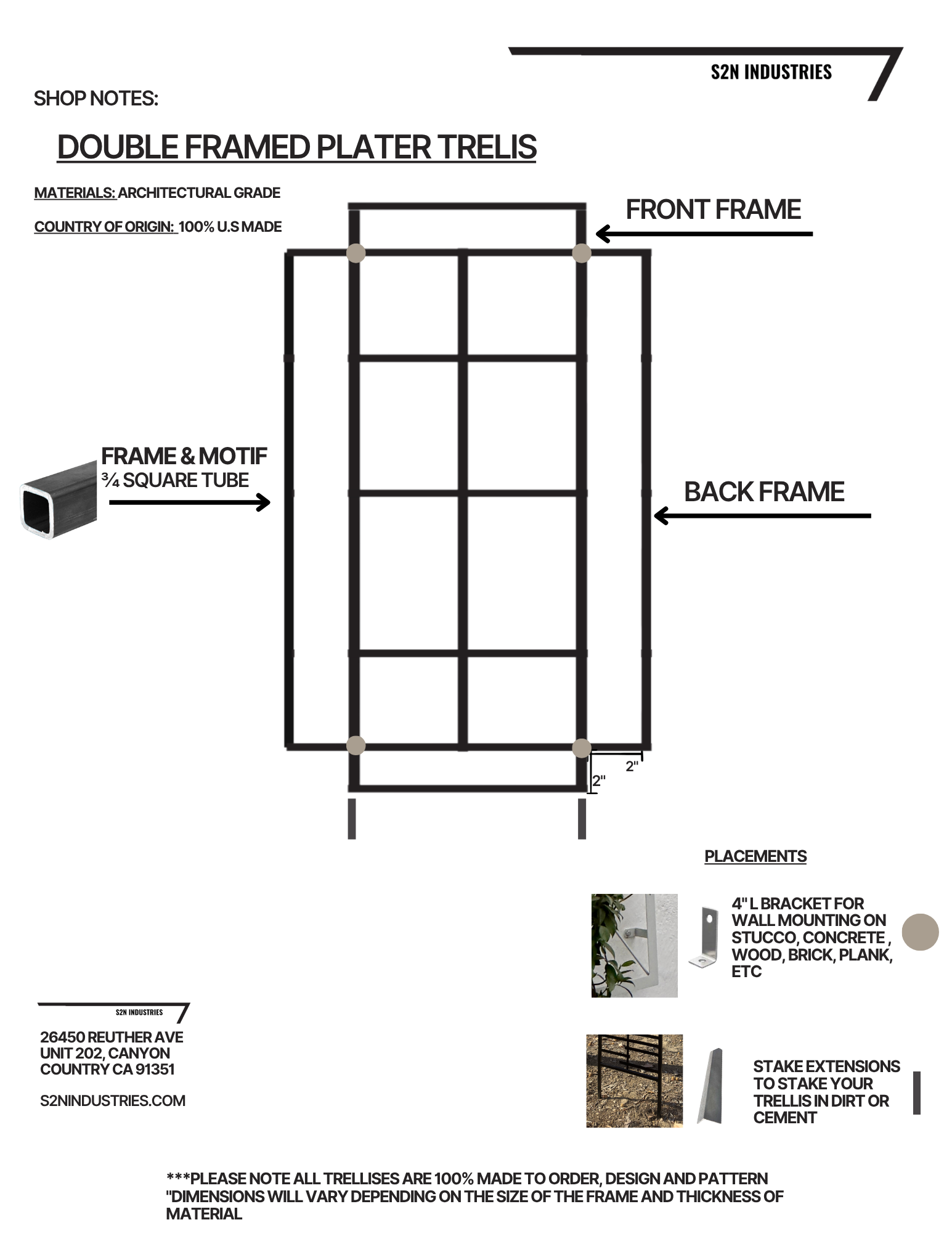 American Built: From the sketches to the final weld, your trellis is made by hand by our master craftsman in Los Angeles, California and made to order using durable US steel 3/4 in, 16 gauge square tubing to create a strong and durable trellis that can support your growing garden