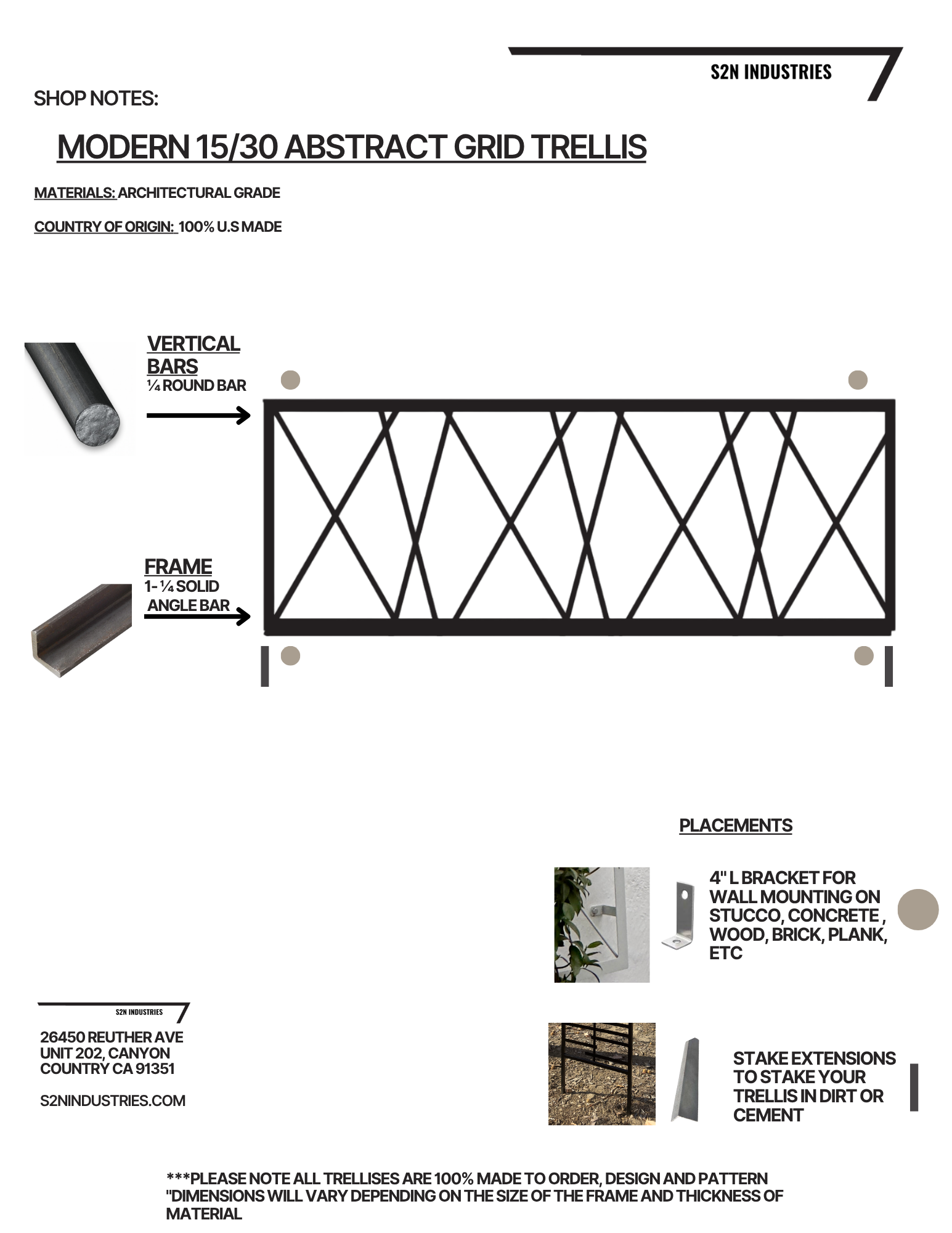 For this trellis use 1/2 solid roll barto create a modern trellis that's hand made to your specifications here in the in the USA. Available in various heights and widths so you can find one that fits your garden and landscape perfectly. Pick from multiple stunning finishes all powder coated to ensure it can withstand hard outdoor elements and last years to come. Easy installation that takes no more than 45 minutes.