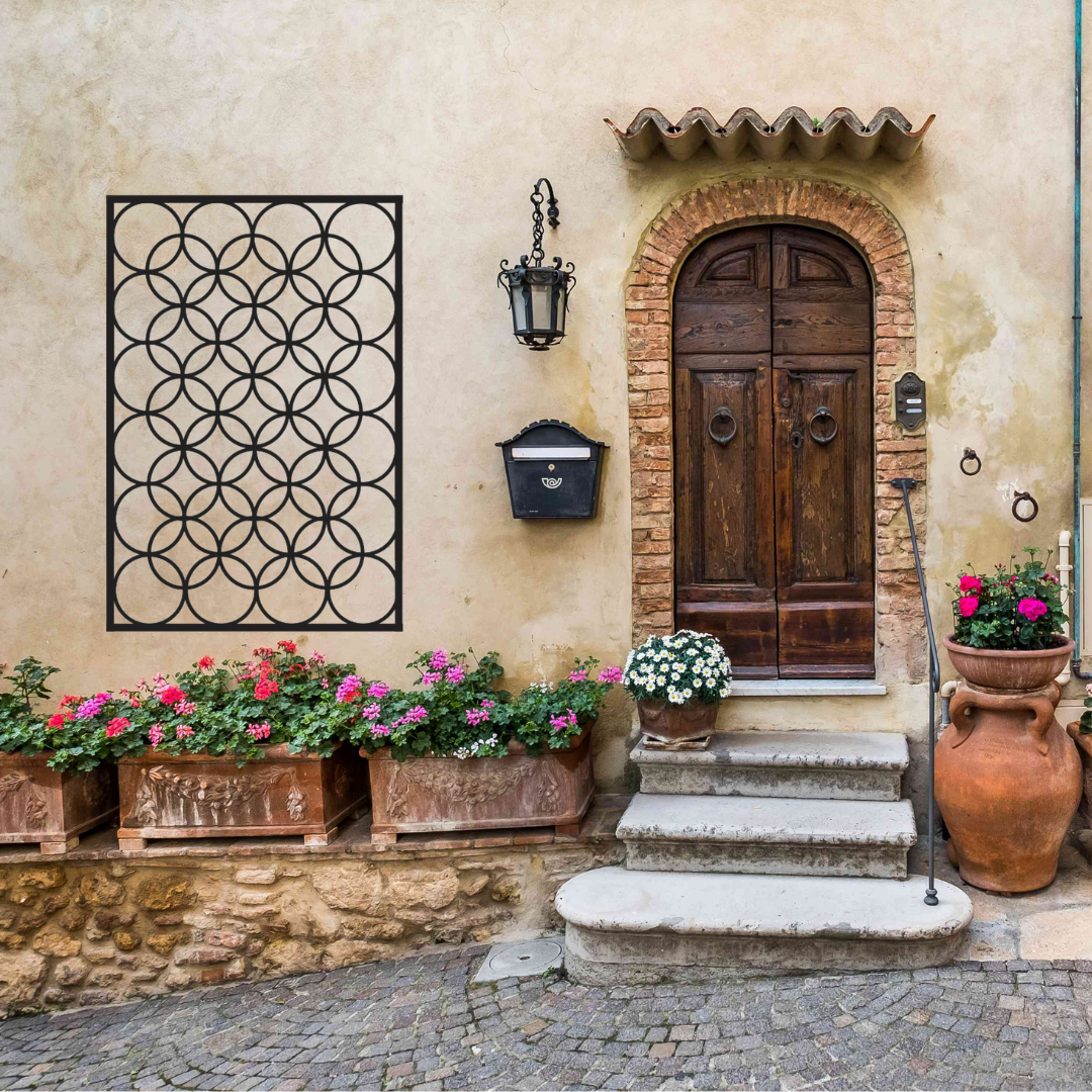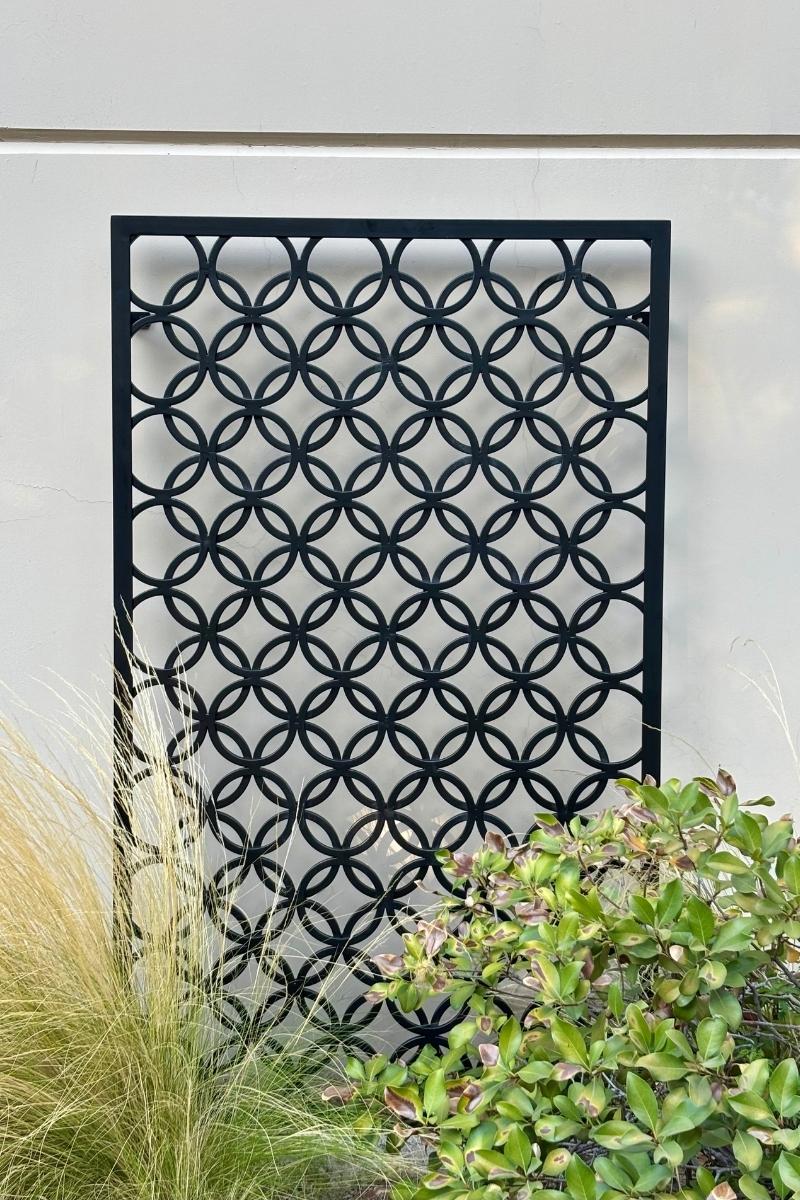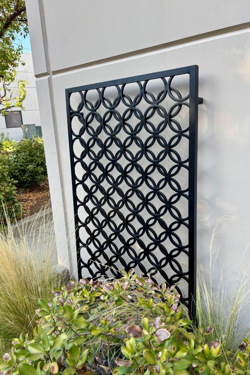 A truly one of a kind piece that is sure to be the focal point of any outdoor space it's placed in. This modern metaltrellis is individually designed and made to order. Hand forged using solid iron angle bar to create the durable frame and thick flat bar hand spun and molded to create the interior circle design that makes it a truly special statement piece. Use it as a stunning trellis to guide your glowing plants, use it as a divider to divide your area for privacy or simply mount it on an empty dull wall and let the more subtle aspects of the design shine and stand out transforming your outdoor space.