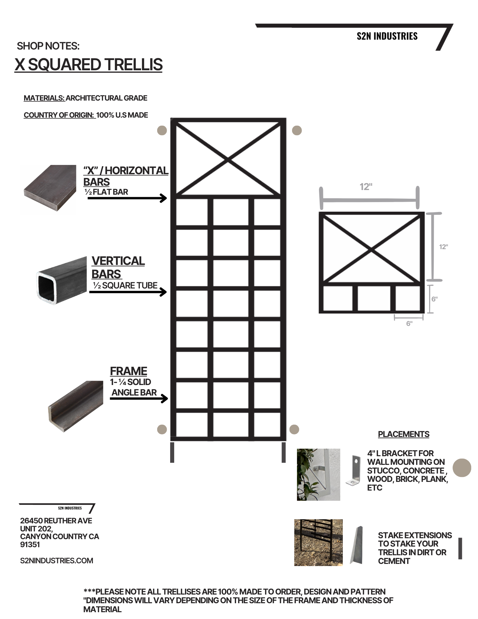 This stunning trellis features a mini square pattern topped with a barn door inspired X motif on top. All put together by hand using solid flat bar and angle bar to create a 1 of 1 custom trellis that is sure to be the taking point of your vertical garden.