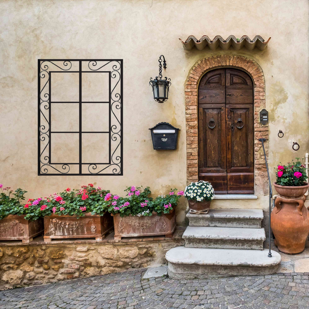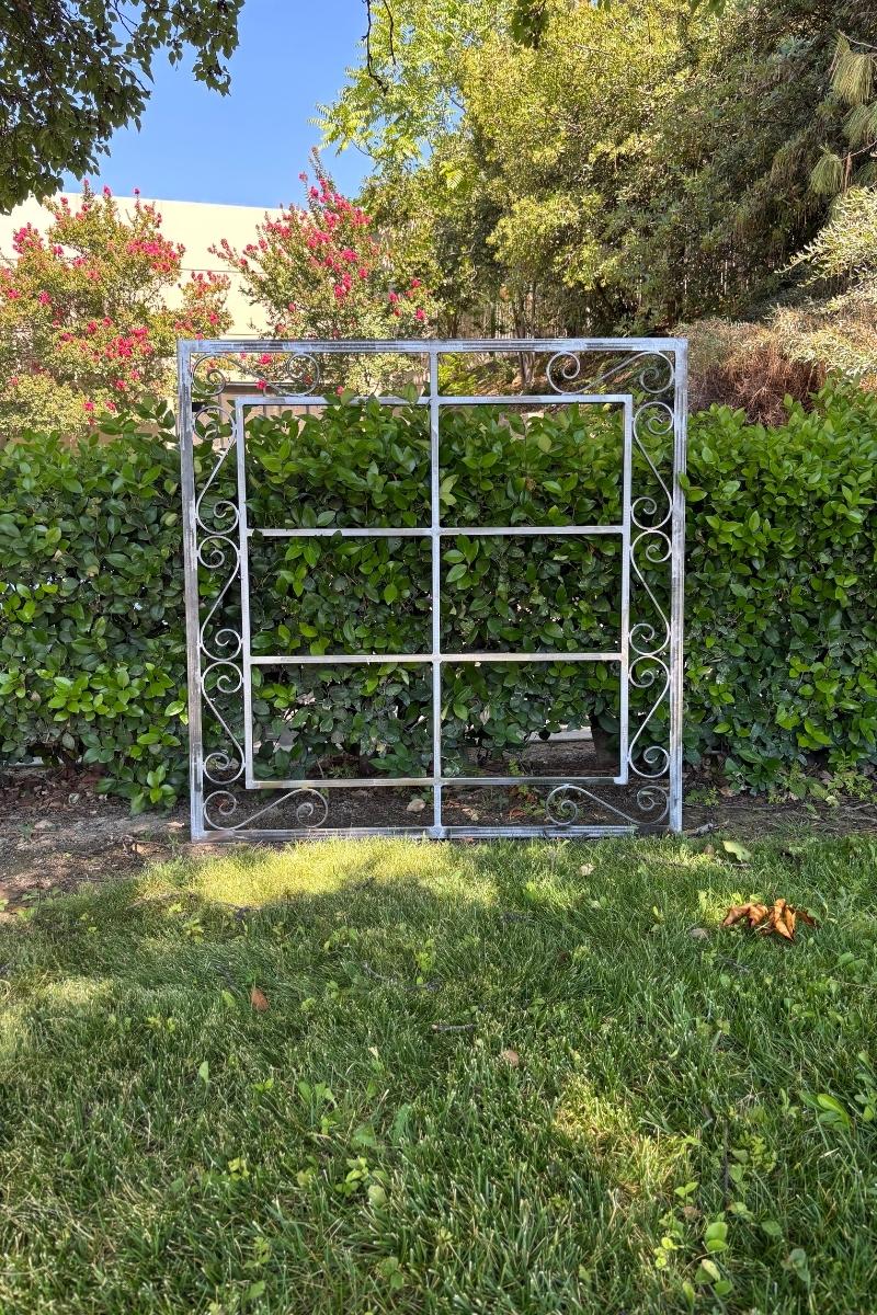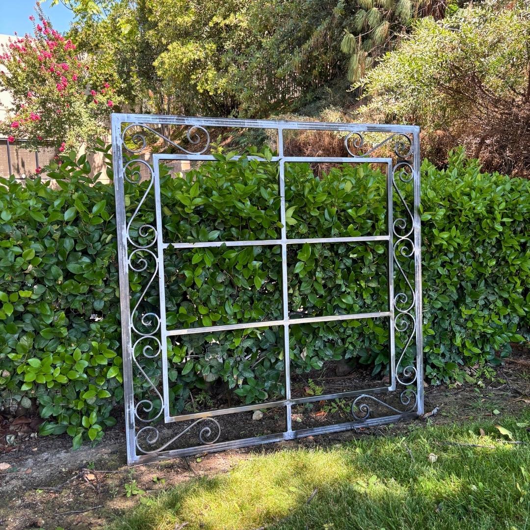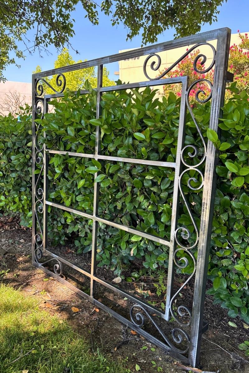 Materials Used: For this spanish stye scroll trellis, hand forged decorative scroll to boarder the interior square grid, all welded onto a solid 1-1/4 angle frame