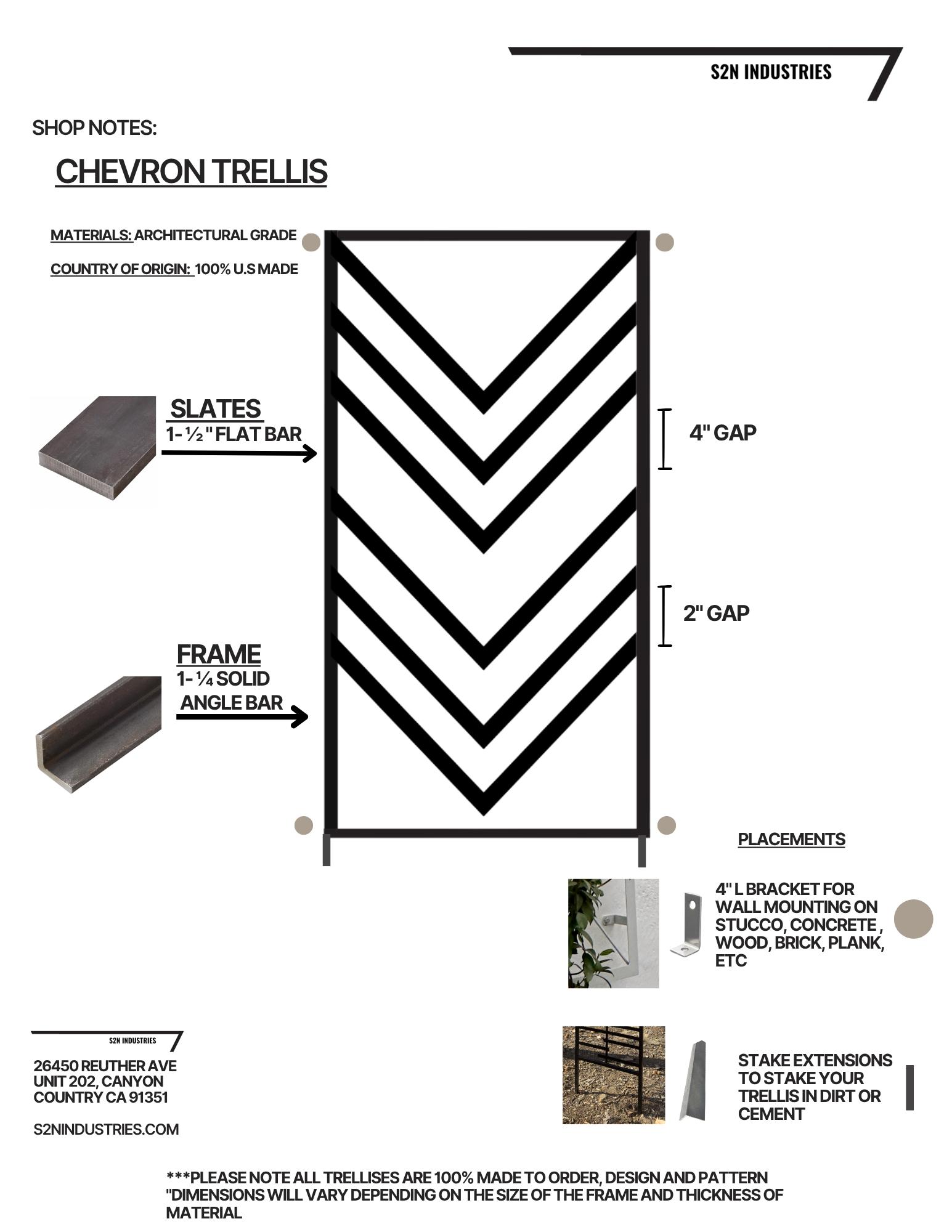 American Built: From the sketches to the final weld, your trellis is hand built in Los Angeles, California and made to order using durable 1-1/4 angle bar and 1", 16 gauge flat bar to create a dramatic Inverted triangle pattern on a durable frame that can support your growing garden. By using solid angle, we can assure no water will get inside the trellis preventing rust from breaking it down